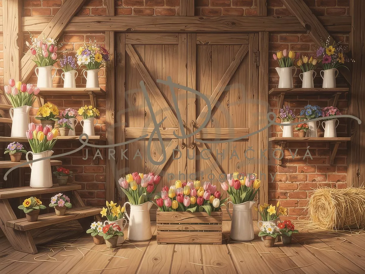 Stodola s tulipány a květinami