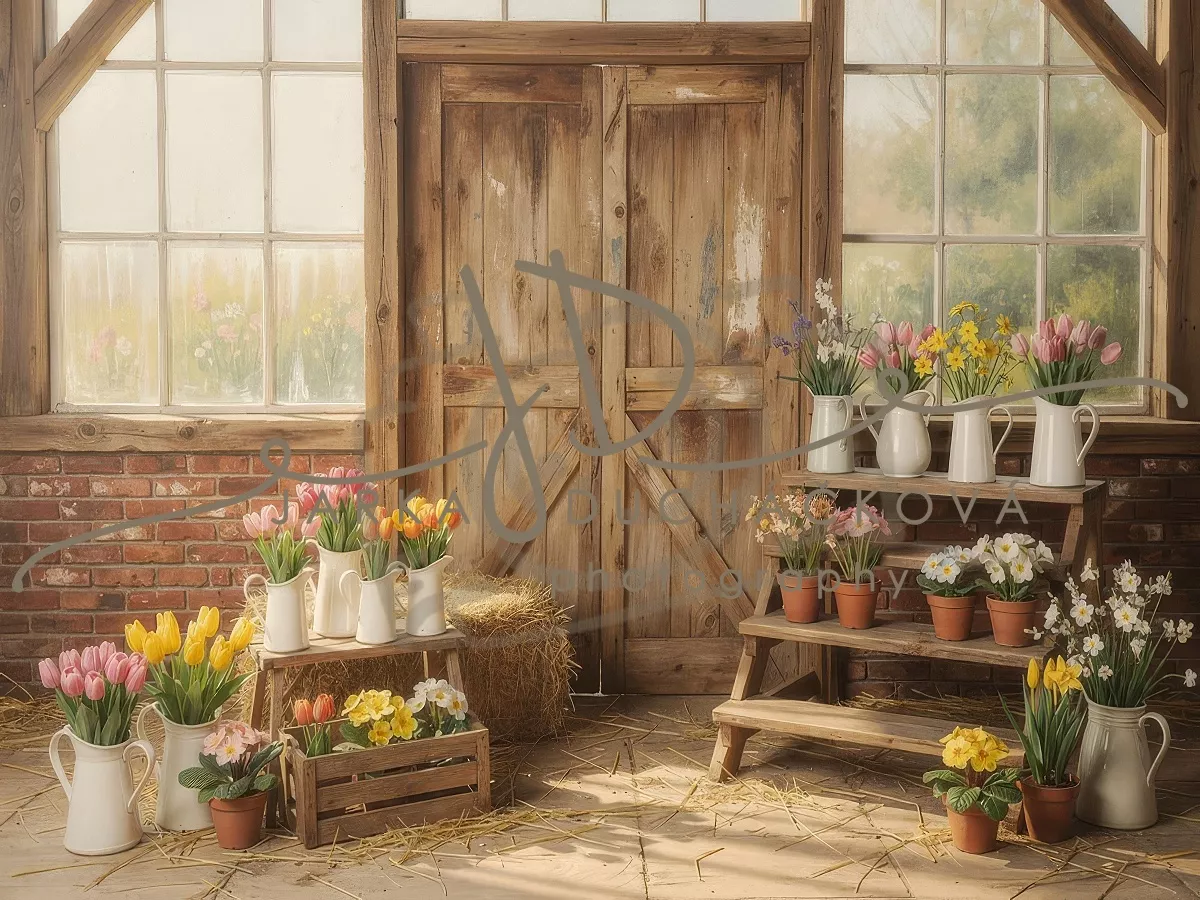 Stodola s tulipány a květinami